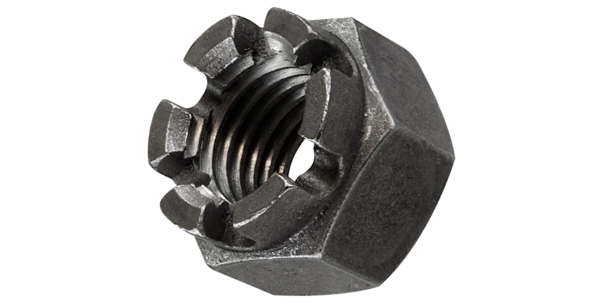 Гайка корончаста DIN 935 - це гайка, яка використовується на різного роду валах, де є вібраційні та динамічні навантаження. При складанні, гайку накручують на стрижень з отвором, крізь проріз і отвір вставляють шплінт розгинаючи його кінці в різні боки. Виходить надійна фіксація, що дозволяє надійно зафіксувати гайку і не дає їй розкручуватися при вібрації.